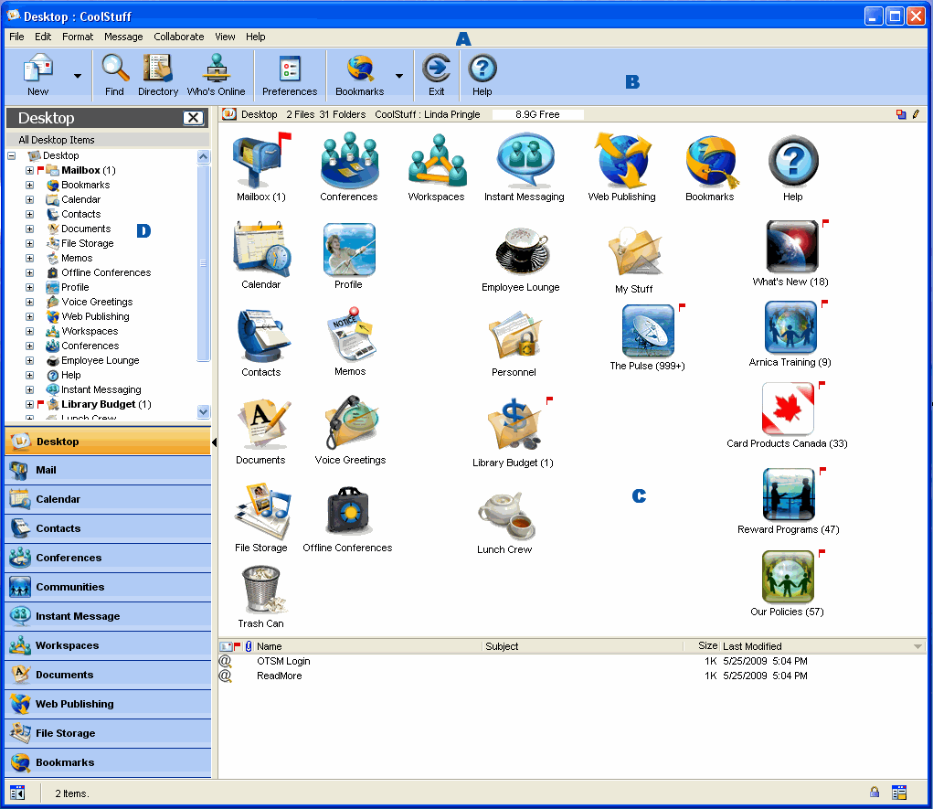 Your administrator may have added other objects to your Desktop, such as conferences, and customized the general Desktop appearance.